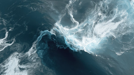 A stunning aerial view of swirling ocean waves captures the dynamic beauty of nature. The vibrant blue tones convey a sense of fluid movement and energy.
