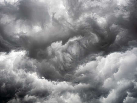 Close-up of stormy gray clouds, moody and dramatic with swirling formations.