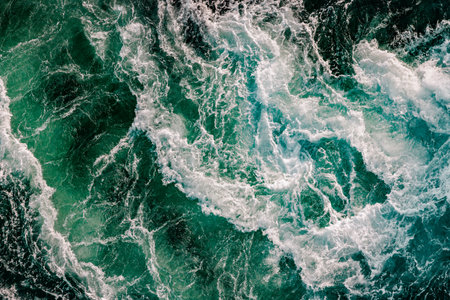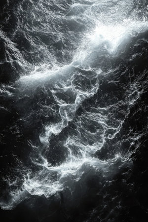 Aerial view of chaotic white foamy sea waves, symbolizing the powerful force of nature.