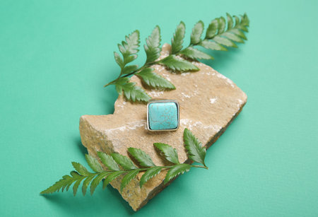Stone with beautiful vintage ring and plant leaves on turquoise background