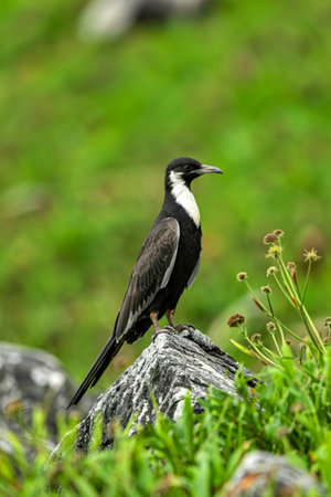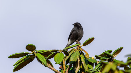 Pied bushchat male bird perched on top of azalea tree in horton plains close up shot.