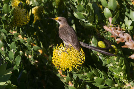 Close up of a Cape Sugarbird sitting on a yellow flower eating nectar