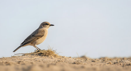 A small, pale brown desert bird, possibly an Isabelline Wheatear, is perched on a sandy mound against a clear, bright sky. The minimalist composition highlights the simple beauty and solitude of wildlife in an arid environment.