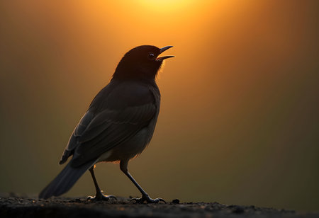 A nightingale sings beautifully at dawn, its delicate silhouette softly illuminated by the first golden light of a new day.
