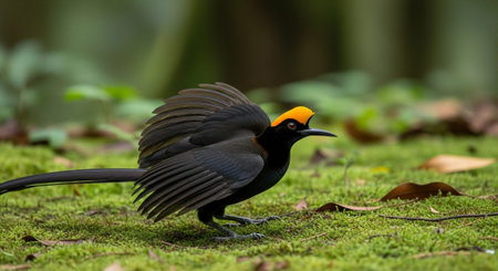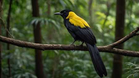A striking yellow bird with a black head rests on a branch adorned with bright orange flowers. The photograph displays a shallow depth of field, with a soft green background. The lighting suggests a natural outdoor setting, offering potential uses for nature-themed projects, editorial content, and decorative purposes.