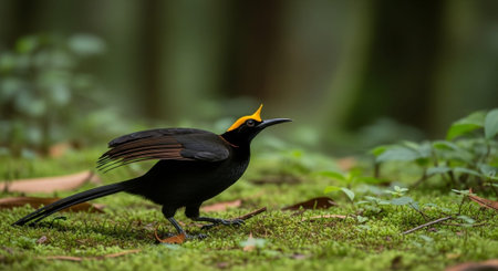 A dark-colored bird with a yellow beak and eye ring is observed among small yellow flowers, set against a blurred green backdrop. The natural lighting highlights the details of the bird's feathers and the texture of the flower petals. This image could be used for various projects needing a touch of nature.