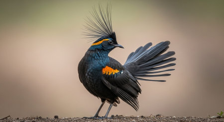 A bird with orange eyes and blue black feathers perches showing its beauty