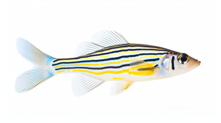 a fish with white stripes is captured in this eye-catching composition. the fish is isolated on a white background, reminiscent of the style of yinka shonibare. this national geographic photo, digitally enhanced by robert irwin, showcases vibrant colors of light yellow and azure. the composition is reminiscent of the works of sebastian errazuriz, creating a visually stunning image. ai generated