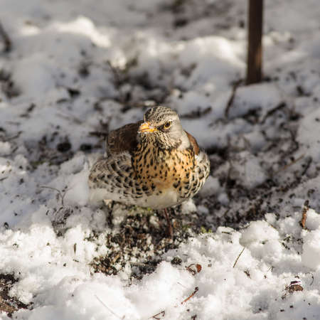 Fieldfare looks for food under the snow in the spring
