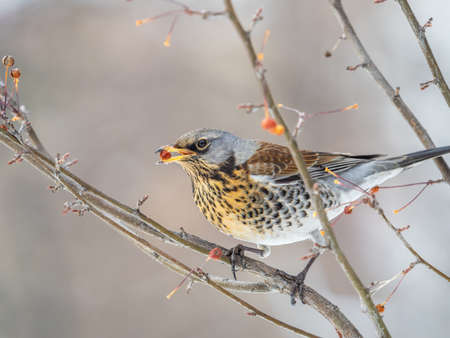 Fieldfare, lat. Turdus pilaris, sitting on the bush and feeding on wild red apples in winter or early spring time.
