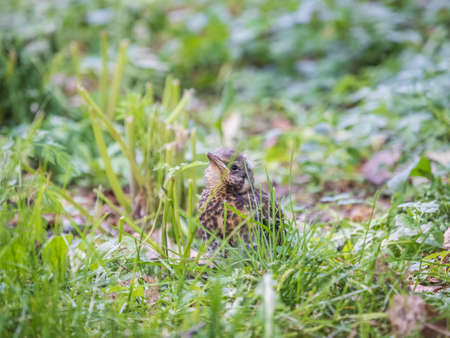 A fieldfare chick, Turdus pilaris, has left the nest and sitting on the spring lawn. A fieldfare chick sits on the ground and waits for food from its parents. Wildlife scene from spring forest.