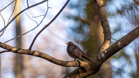 Blackbird on tree branch. Common blackbird. Turdus merula. Eurasian blackbird. Beauty in nature.