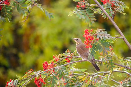 Bird thrush sitting on a branch. Tree Rowan.