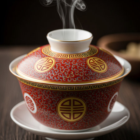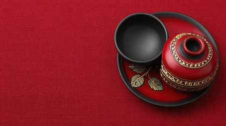 This image features a beautifully arranged red bowl and teapot on a textured background, showcasing intricate leaf designs and traditional craftsmanship.