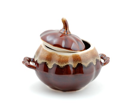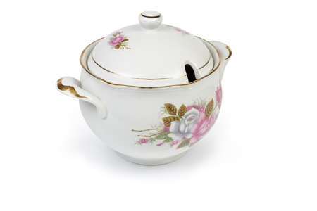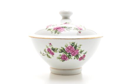 Vintage style chineese porcelain sugar bowl on table in retro cafe.
