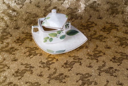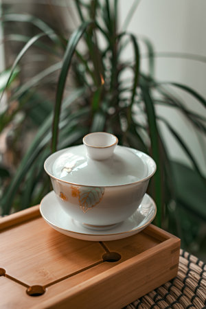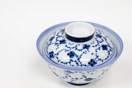 Close up of gaiwan.traditional chinese porcelian cup with sakura pattern