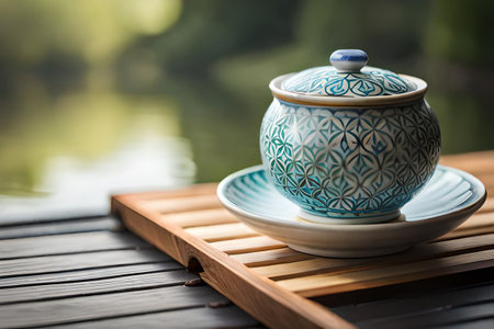 An Elegant Teacup Artfully Arranged on a Wooden Tray, Complemented by a Lush Foliage Background