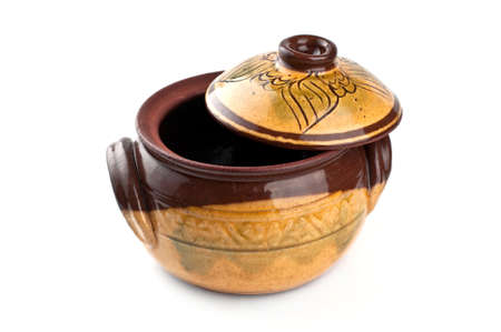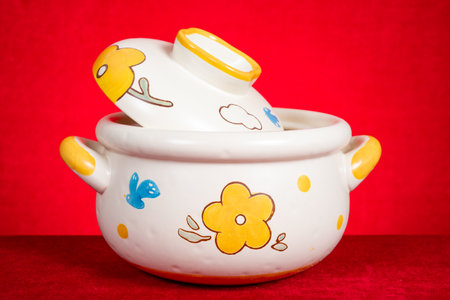 Top view of empty ceramic soup bowl isolated on beige background. empty ceramic pan. Flat lay of utensils for cooking