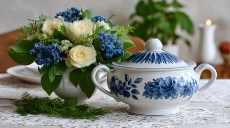 Elegant table setting with white roses and blue flowers next to a decorative tureen