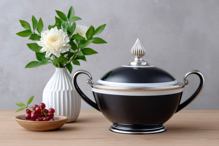 Tureen, white flowers in a vase, and red grapes creating an elegant and formal still life