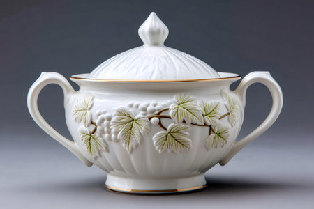 Porcelain sugar bowl featuring silver trim, ornate handles, and a decorative lid on a gray background