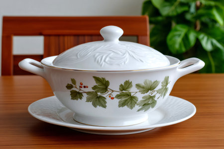 Porcelain soup tureen decorated with botanical pattern serving dinner on a wooden table