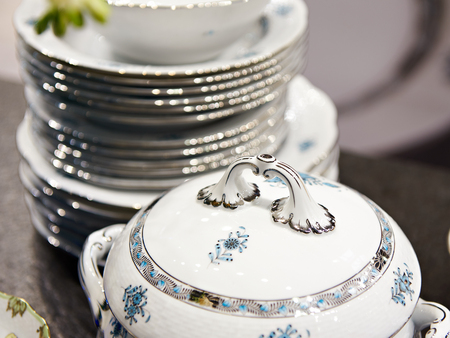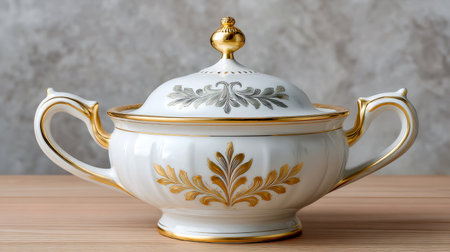 White and gray porcelain tureen with golden elegant patterns on a wooden dining table