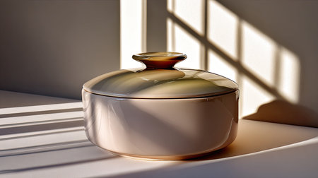 A beautiful ceramic container featuring a smooth surface and modern design, set against a minimalistic backdrop with soft shadows and natural light creating an inviting atmosphere.