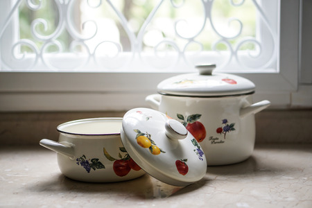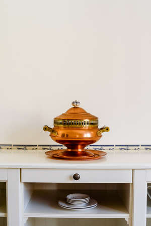 Traditional vintage Portuguese copper cataplana cooking pot on the kitchen cupboard Algarve, Portugal, Europe.