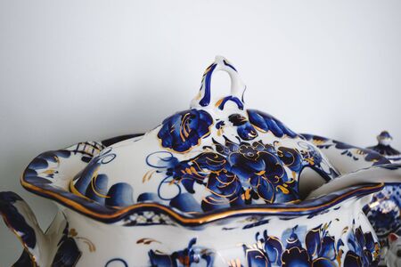 Traditional Russian porcelain. Beautifully crafted hand painted ceramic objects. Generate ai