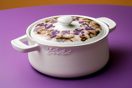 This image features an elegant ceramic soup tureen with a lid and ornate handles, accompanied by fresh raspberries and a silver spoon set against a vibrant backdrop.