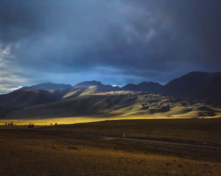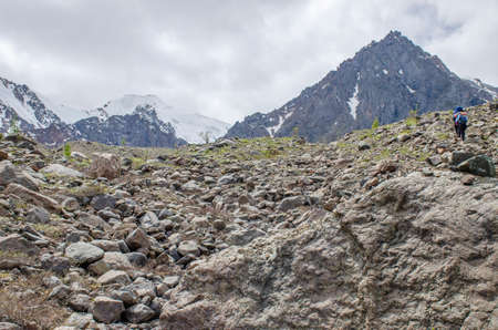 Beautiful Tien shan peaks and mountains near Almaty. Dramatic overcast sky. Beauty world.