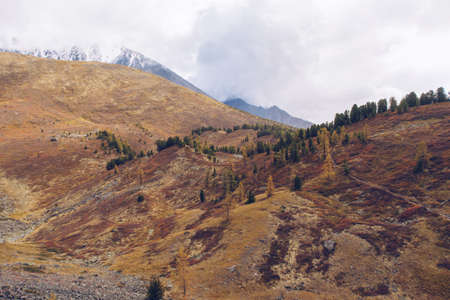 Autumn in the valley of the Kyzylshin River, view from the top of the hill. Kosh-Agachsky District, Altai Republic, Russia