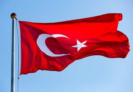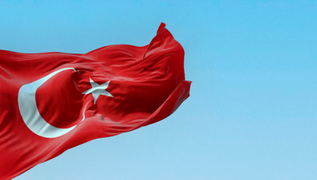 Turkish flag waving against a bright blue sky, symbolizing national pride and identity during a sunny afternoon