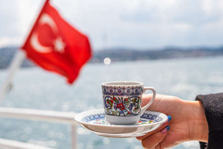 Turkish national flag fluttering on Bosphorus against the blurred cityscape of Istanbul, Turkey