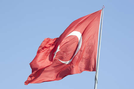 Turkish flag on flagpole waving in wind against blue sky. High quality photo