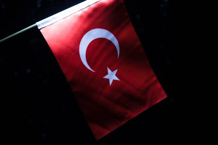 Turkey small flag on dark background. Concept of crisis of war and political conflicts between nations. Selective focus
