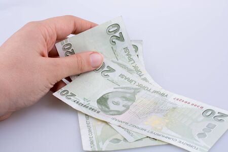 Hand holding 20 Turksh Lira banknote on white background