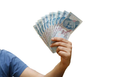 Businessman hand holding and counting one hundred Turkish liras banknotes, isolated on white background.