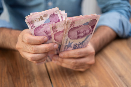 Person holding stacks of Turkish lira banknotes on a wooden surface. Concept of financial management, economic conditions, and currency inflation