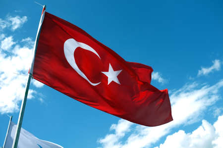 The national flag of Turkey flutters in the wind against a blue sky.