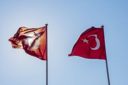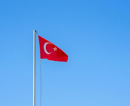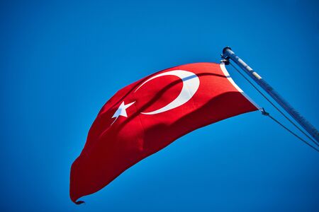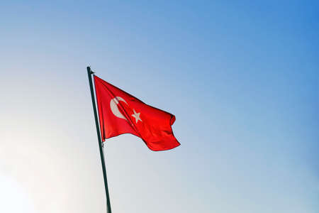 Turkish flag on flagpole waving in wind against blue sky. High quality photo
