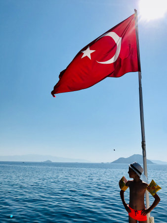A young boy wearing swim gear stands under the Turkish flag by the sea. The scene captures the essence of a sunny day by the water, exuding freedom and tranquility.