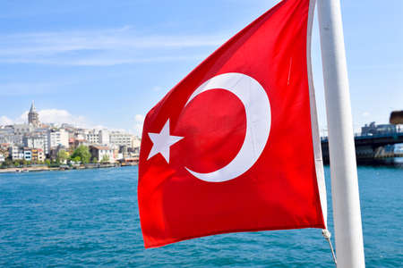 Turkish national flag fluttering on Bosphorus against the blurred cityscape of Istanbul, Turkey