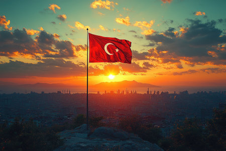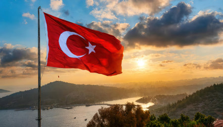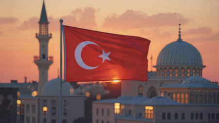 Turkish flag waving gracefully in the wind at sunset, with a mosque silhouette in the background, celebrating the rich culture and deep-rooted traditions of Turkey against a stunning evening sky