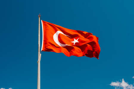 Turkish flag waving in the blue sky, flagpole,