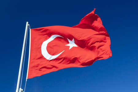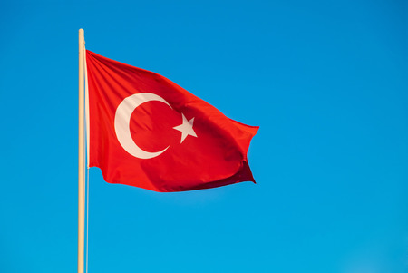 Bright Turkish flag waving in the wind on blue sky background