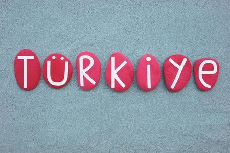 TURKEY word made of red stone on sand beach background.