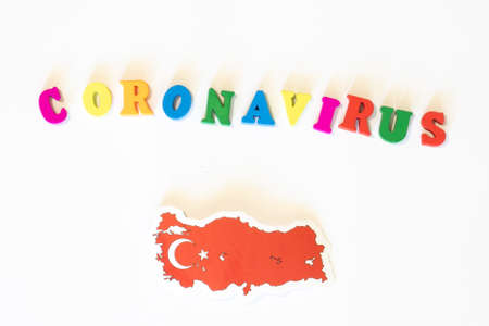 Turkey national flag on a white background with the inscription Corona virus made with letter board. Coronavirus is a pandemic virus