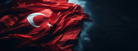 Wavy flag of Turkey, bright red fabric, dark mystical background, banner, copy space.